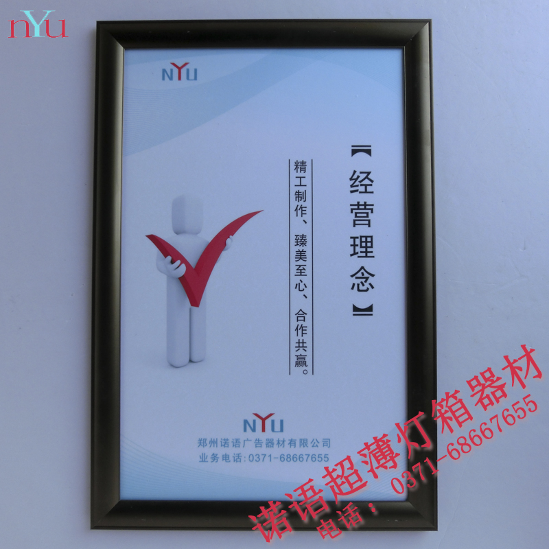 鄭州諾語(yǔ)超薄燈箱工藝有限公司,是一家集生產(chǎn)、設(shè)計(jì)、制作、銷(xiāo)售于一體的專(zhuān)業(yè)燈箱生產(chǎn)企業(yè)。擁有先進(jìn)的機(jī)械生產(chǎn)設(shè)備和一批技術(shù)精湛、經(jīng)驗(yàn)豐富的專(zhuān)業(yè)制作團(tuán)隊(duì)。公司主要生產(chǎn)超薄燈箱、磁吸燈箱、水晶燈箱、防爆燈箱、感應(yīng)燈箱、鋁型材畫(huà)框等產(chǎn)品。