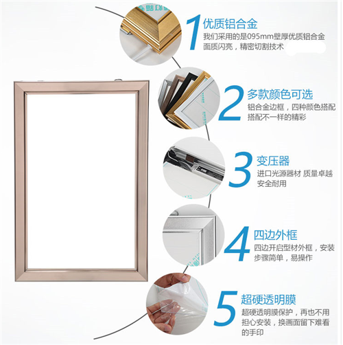 超薄燈箱采用:雕刻導(dǎo)光板、絲印導(dǎo)光板和納米導(dǎo)光板滿(mǎn)足不同客戶(hù)的需求。本公司生產(chǎn)的超薄燈箱系列使用于企業(yè)、商貿(mào)中心、超級(jí)市場(chǎng)、銀行、連鎖店、飯店、酒樓、機(jī)場(chǎng)、車(chē)站、地鐵、站臺(tái)、電梯、室內(nèi)裝飾、婚紗影樓、大型展覽工程等。